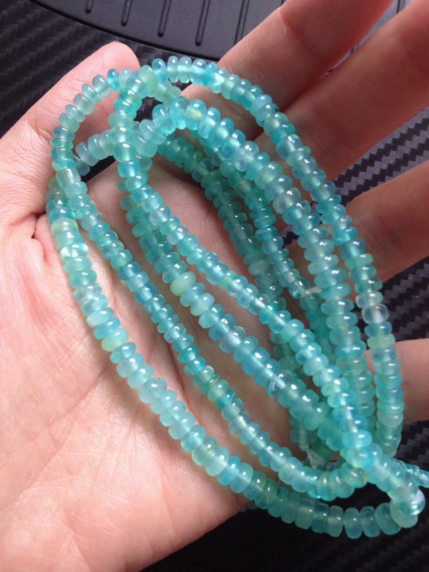 Very rarely found in the market, these are gem quality Blue Peruvian Opal with a jelly like quality. Amazing color and clean stones. Smooth Rondelles measuring 4.6-5.6 mm for 1 strand and 3.5-4.65 mm for the other, 18" strands.